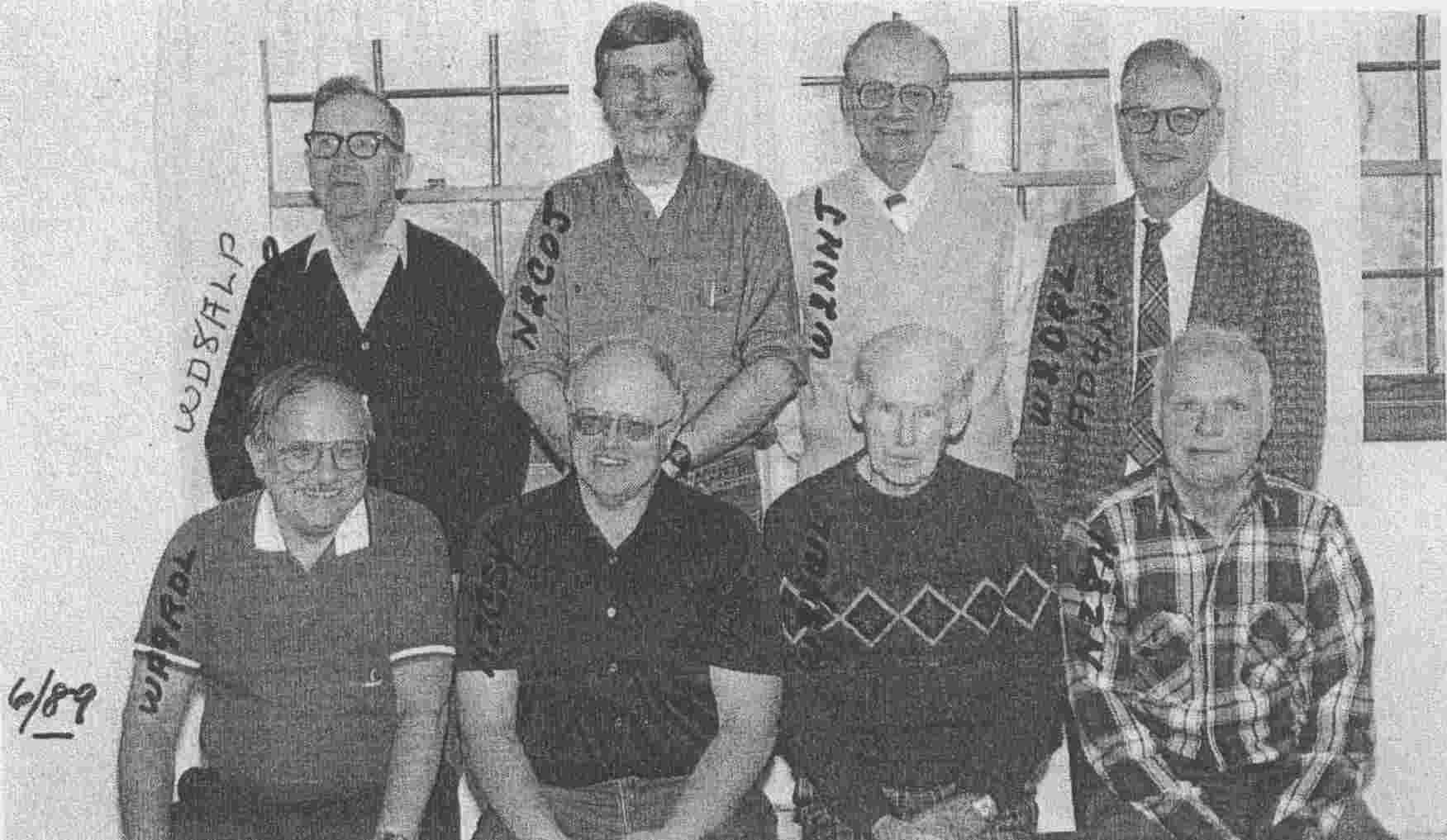 L-R (top): George (WD8ALP) Lewis, Steve (N2COJ) Elliott, Norm (W2NNJ) Hinkle, Don (AD4NT) Cronemeyer L-R (bottom): Laurel (WA9RDL) Short, N2CSJ, W8YWL, George (NZ8H) van Farowe June 1989 |